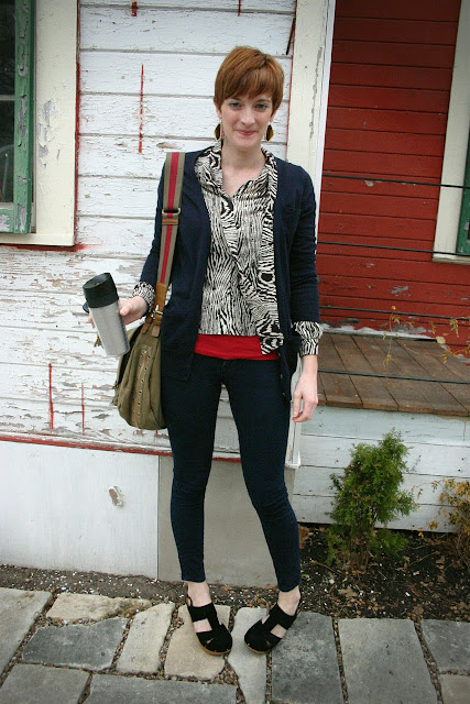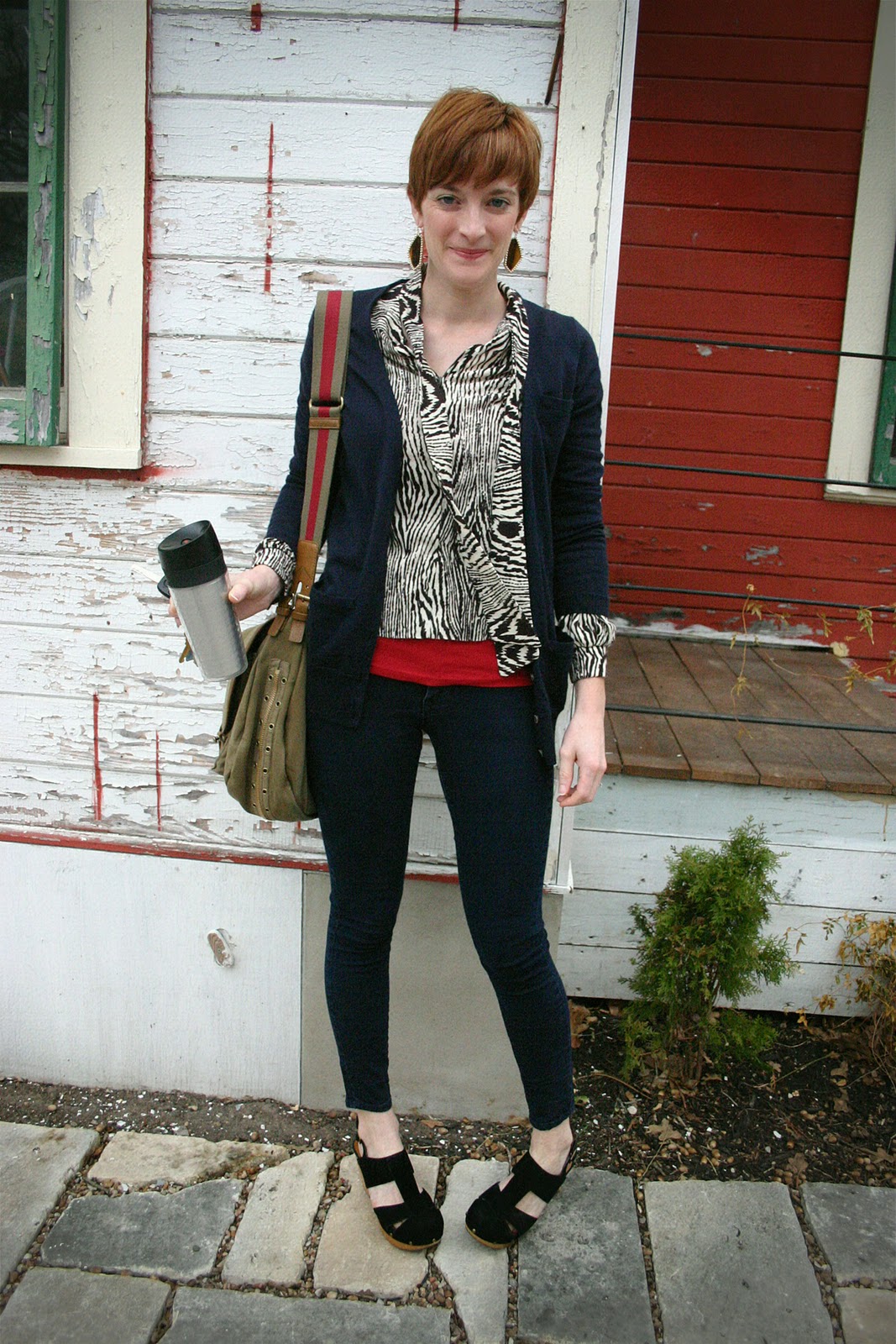 Here’s an example of what I look like when I am on my way to work and I forgot to take a picture of my outfit, knowing that it will be too dark when I get home to play catch-up. I have a coffee mug and keys in my hand, and I don’t even care if you all see the dying jasmine (got frozen to death, I didn’t kill it!) and the sadly peeling paint.