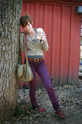 In an effort to seriously catch up, you lucky readers get not one but TWO outfit posts today. This one involves purple cords, and I wore it today. The coffee I am drinking in the picture was a red eye, and when I finished it, I felt really weird. Which was fine. I went out to Indian food with my coworkers in celebration of my last week of work. Maybe the fact that I was eating Indian lunch buffet at 11am was what made me feel weird, now that I think of it…hmmm. Either way, it was delicious, and I was wearing purple pants! This comfy sweater came in the mail from ModCloth yesterday and I was certain it would be perfect. I love the fact that it’s chunky, yet cropped. I can’t wait to wear it with Hilah’s favorite tie-dyed pants.