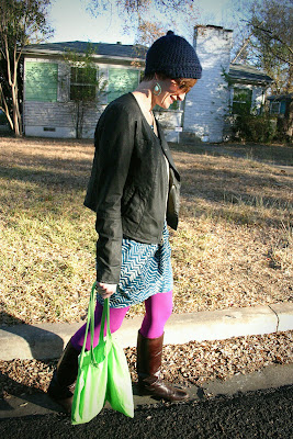 Wow it’s finally really fall. I think. Anyway, these tights were enough to keep me warm today, but juuuust barely. At work I wore some borrowed berry-colored earrings that matched the tights, which I think worked better, but I don’t own them, so the turquoise ones won in the end! Don’t you think this hat is adorable? I do. My friend Lacy made it for Paul for his birthday last year, but it fits my midget head a little better….I’m glad it’s cold enough to cover my too-long, root-showing hair with a hat. OMG I am so excited to eat Hilah‘s vegan chili tonight!!!