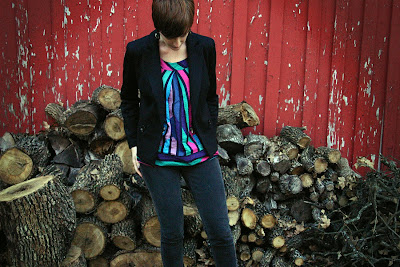 Another day, another woodpile pose. This time I feel like I should be posing out on the dance floor, but alas, there’s no dance floor in our backyard….yet. It suddenly got really really cold here, so I am not sure how long I can wear this flimsy blazer for, but I hardly recognize myself in it anyway. I don’t think I have ever owned a black jacket before. Is that weird? Oh except my leather one. Never a black blazer, then. Whatever. I worked at the jewelry shop today, Black Friday, and it was a zoo. What a way to work off my GIANT DINNER. Pretty tired now, but not too tired to say yes to a party invitation. Later!