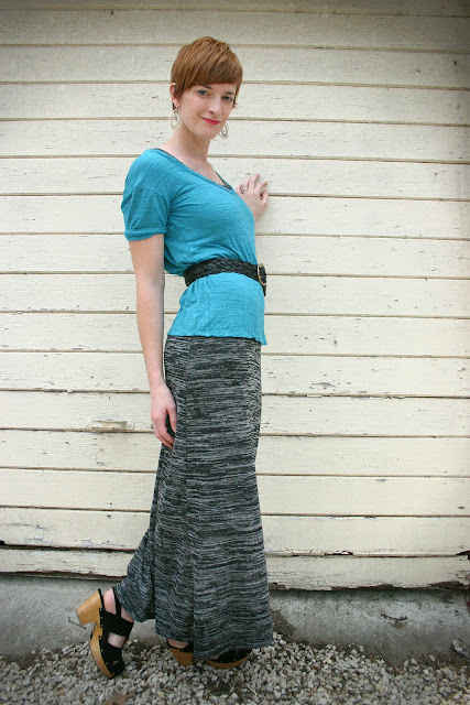 | Maxi-dress: ModCloth, T-shirt: Madewell, Belt: UO, Clogs: BC (endless.com), Earrings: Kendra Scott |