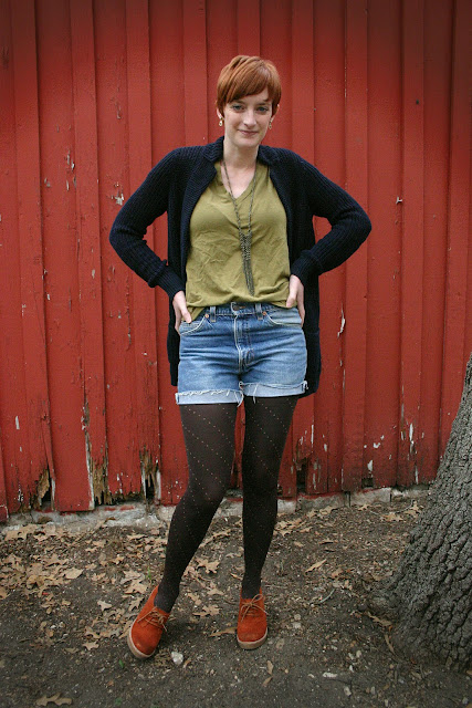 | Tee: JCrew, Shorts: men’s Levi’s (buffalo exchange), Tights: Gap, Shoes: Rust-Have Wedges (ModCloth), Necklace: F21, Sweater: Vince |
